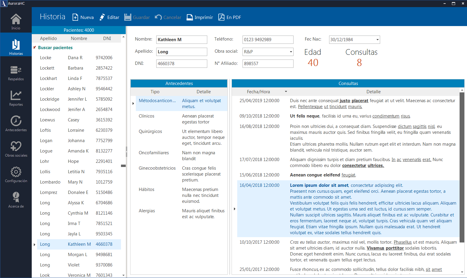 Por su privacidad y sencillezRegistre las consultas de sus pacientes en un avanzado software de gestión de historia clínica. Obtenga un acceso instantáneo a la información. Imprima o exporte a PDF la historia de sus pacientes. Con AuroraHC sólo usted tiene acceso a sus registros.